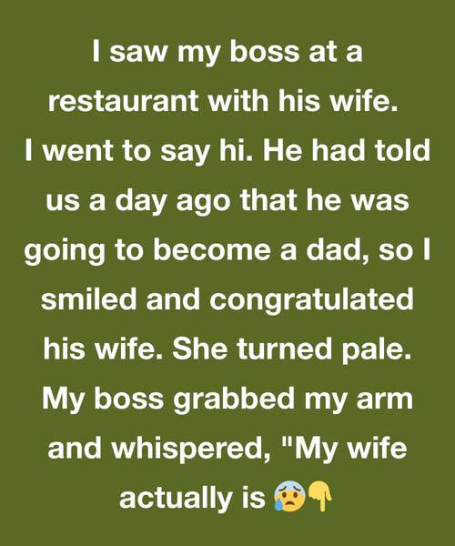 I saw my boss at a restaurant with his wife. I went to say hi. He had told us a day ago that he was going to become a dad, so I smiled and congratulated his wife. She turned pale.
